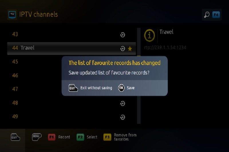 Adding a particular channel from the IPTV playlist window to the list of favourites can be accomplished by following the steps that are outlined below: