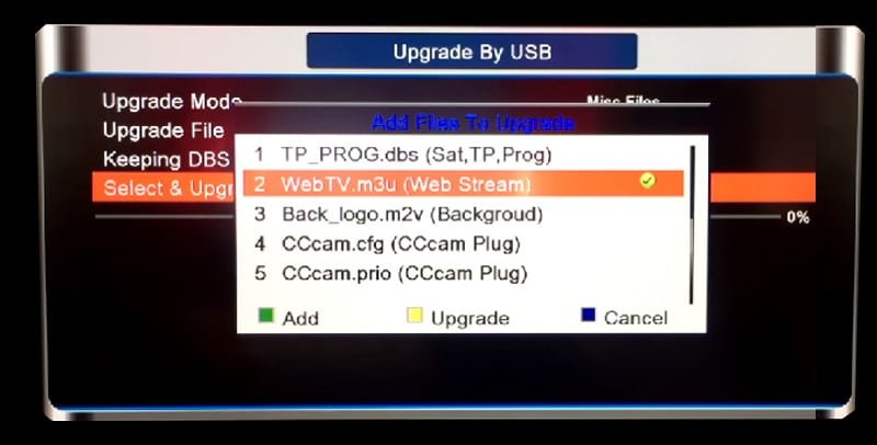 Step 6: In the next window, select “WebTV.m3u (Web Stream)” and make sure there is a green checkmark on the right side. After that, press the yellow button to start the process of upgrading.